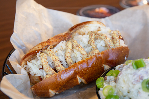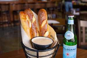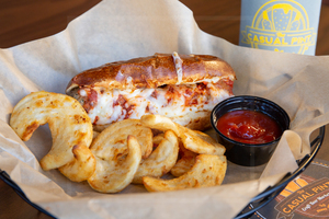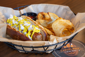 Served with your choice of side. Proudly served Johnsonville 1/4 pound brats marinated in local craft beer & served on a toasted Bavarian pretzel bun.